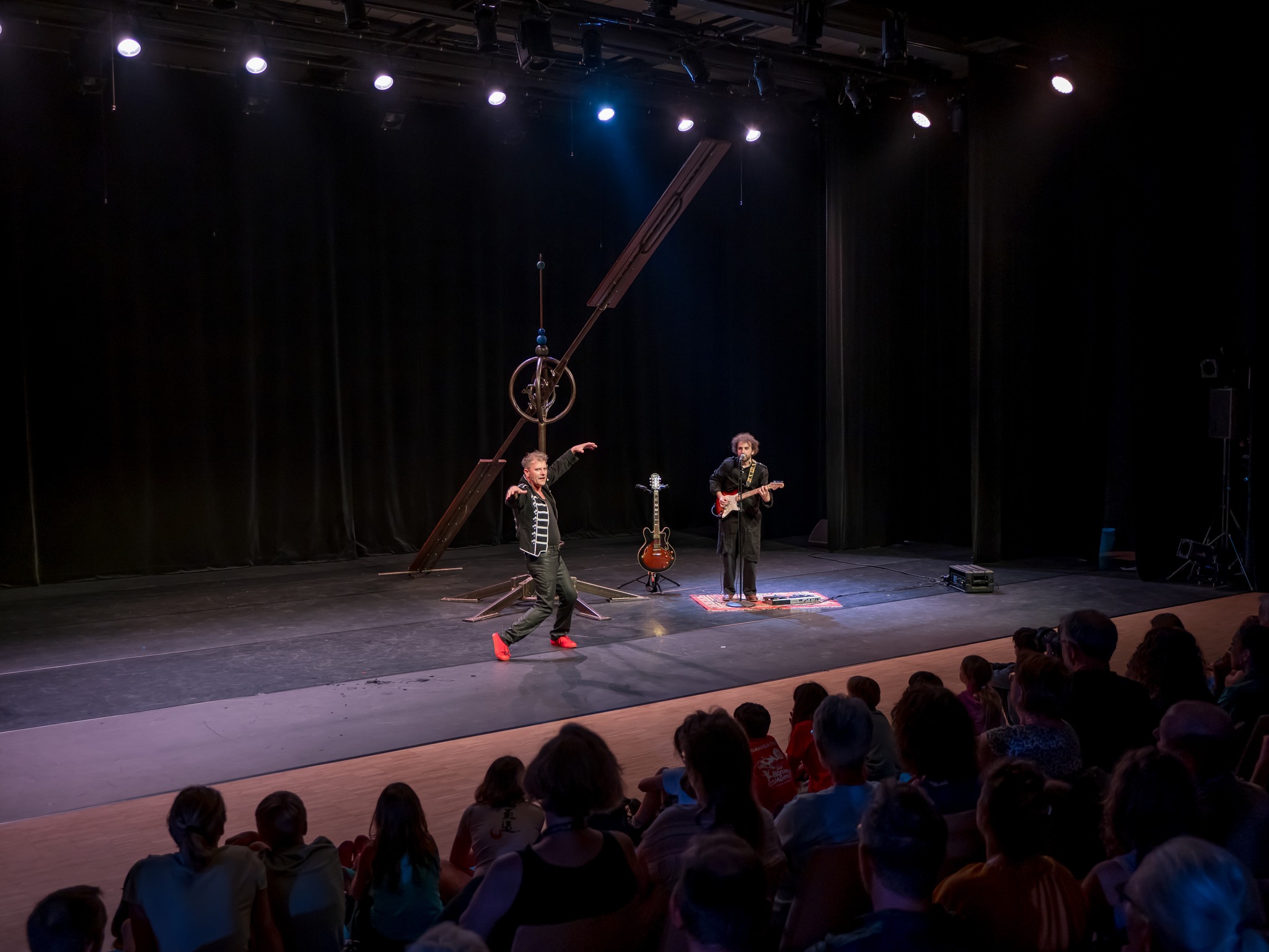 Frédéric David par son élocution, son engagement physique et la douceur de son visage arrive à passer de la bête la plus monstrueuse au petit garçon racontant son aventure. Lui et son compère Jeff Manuel – plus discret, mais d’un appui humoristique et subtil – amènent le public à participer à cette histoire de manière ludique et naturelle. Un spectacle rempli de messages (sans être moralisateur pour autant), et doté d’un joli tour rock’n’roll.